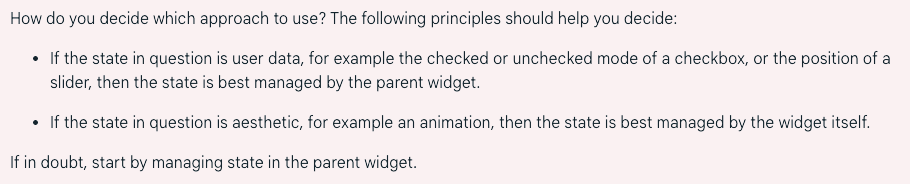 - 두 번째, 만약 상태 관리가 고민되는 위젯이 애니메이션과 같이 aesthetic에 관한 것이라면- 예쁜 화면 만들기 용도이고, 이 상태가 외부 위젯에 영향을 미치지 않는 범위에 있다면-이 상태는 해당 위젯이 독립적으로 관리하는 것이 베스트일 수 있다.