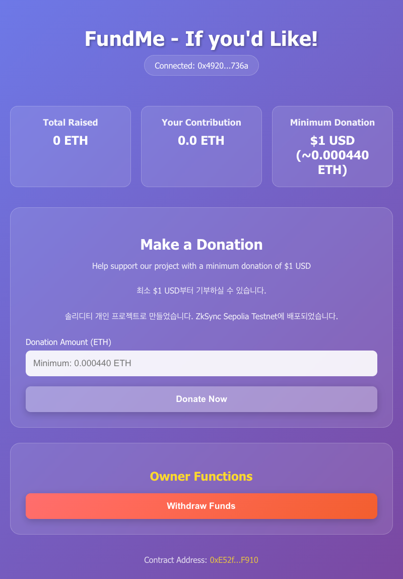 솔리디티 컴파일러에서 ABI 확인하고, zkSync Seplia testnet 컨트랙트 주소에다가 프론트엔드를 붙였다. 메타마스크 지갑 연동은 ehter.js가 해 줬다.