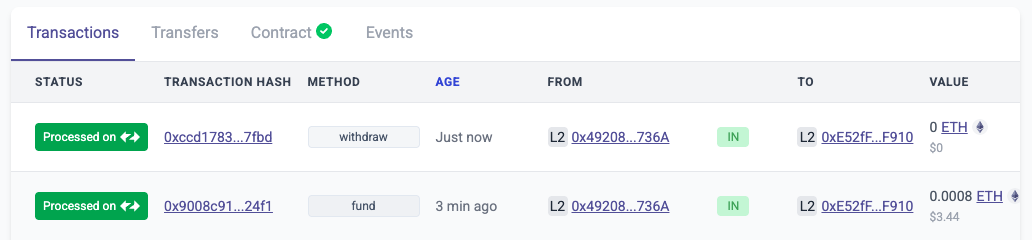 컨트랙트 트랜잭션을 확인해보니, 내가 0.0008이더를 기부하면서 약 3.44달러를 냈고, 다시 빼간 것을 알 수 있다.
