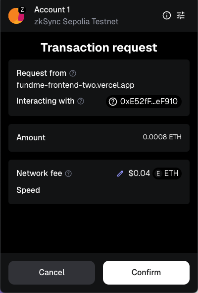 그러면 이렇게 Transaction request가 팝업창으로 뜬다. 네트워크 비용이 0.04달러 가량 든다고 하는군.